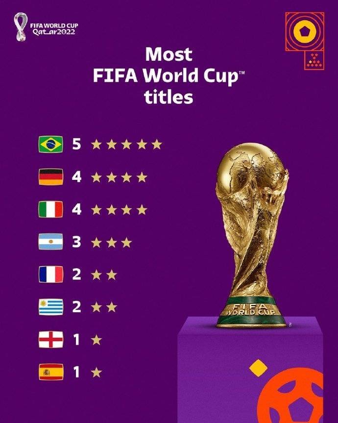 男足世界杯当中,五星巴西高居榜首,德国意大利四星紧随其后,阿根廷在卡塔尔世界杯夺冠后三颗星排名第四。