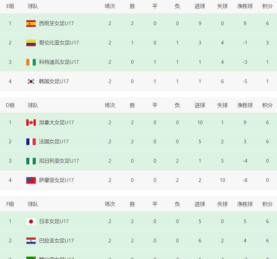 日本与朝鲜双双取得两连胜,提前一轮锁定16强席位;而中国女足在2-5不敌美国后,仍握有出线主动权;韩国女足,她们以0-5的悬殊比分惨败于西班牙,遭遇本届赛事最惨痛失利。