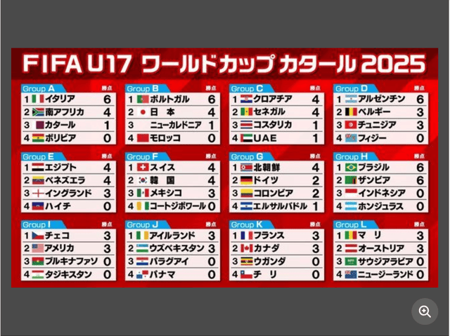此外,截至北京时间8日,本届U-17世界杯(卡塔尔,3日至27日)结束了E、F、G、H组的第二轮比赛。本届赛事共有48支球队参加,分为12个小组进行小组赛。赛制规定,各小组前两名以及成绩最好的8个小组第三名,共计32支球队将晋级淘汰赛阶段。
