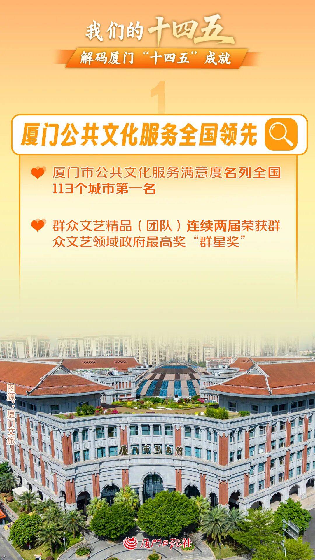 全市10家公共图书馆、7家公共文化馆全部获评国家一级图书馆、国家一级文化馆;厦门市博物馆、华侨博物院被评为国家一级博物馆;2024年5月,在全国公共服务质量监测情况通报中,厦门市城市公共文化服务满意度名列全国113个城市第一名。