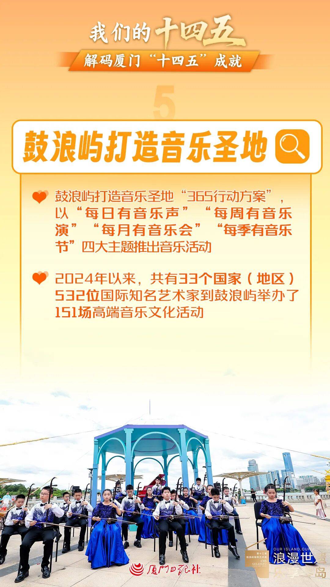 鼓浪屿打造音乐圣地“365行动方案”。一是每日有音乐声。钢琴博物馆每天推出不少于6场钢琴演奏;管风琴艺术中心每天推出6场管风琴演奏;八卦楼风琴博物馆每天开展6场讲解演奏;重要街头空间有12组街头艺人“定时、定点、定分贝”演出。二是每周有音乐演。每周五举办1场管风琴音乐会;每周日开展1场南音展演;每周末开展至少4场音乐快闪。三是每月有音乐会。每月在音乐厅举办1场诗歌音乐会、2场高端音乐会及6场高水平公益性音乐文化演出;每月举办1次菽庄诗会吟诵活动;每月举办1次庭院音乐会。四是每季有音乐节。鼓浪屿围绕“品牌化、国际化、市场化、大众化”目标,打造既有文化底蕴又有商业价值的音乐文化名片,全年重点推进4个大型品牌文化活动,每年4月举办鼓浪屿诗会,7月举办鼓浪屿音乐季,10月举办鼓浪屿钢琴艺术周,12月举办鼓浪屿新年音乐会。