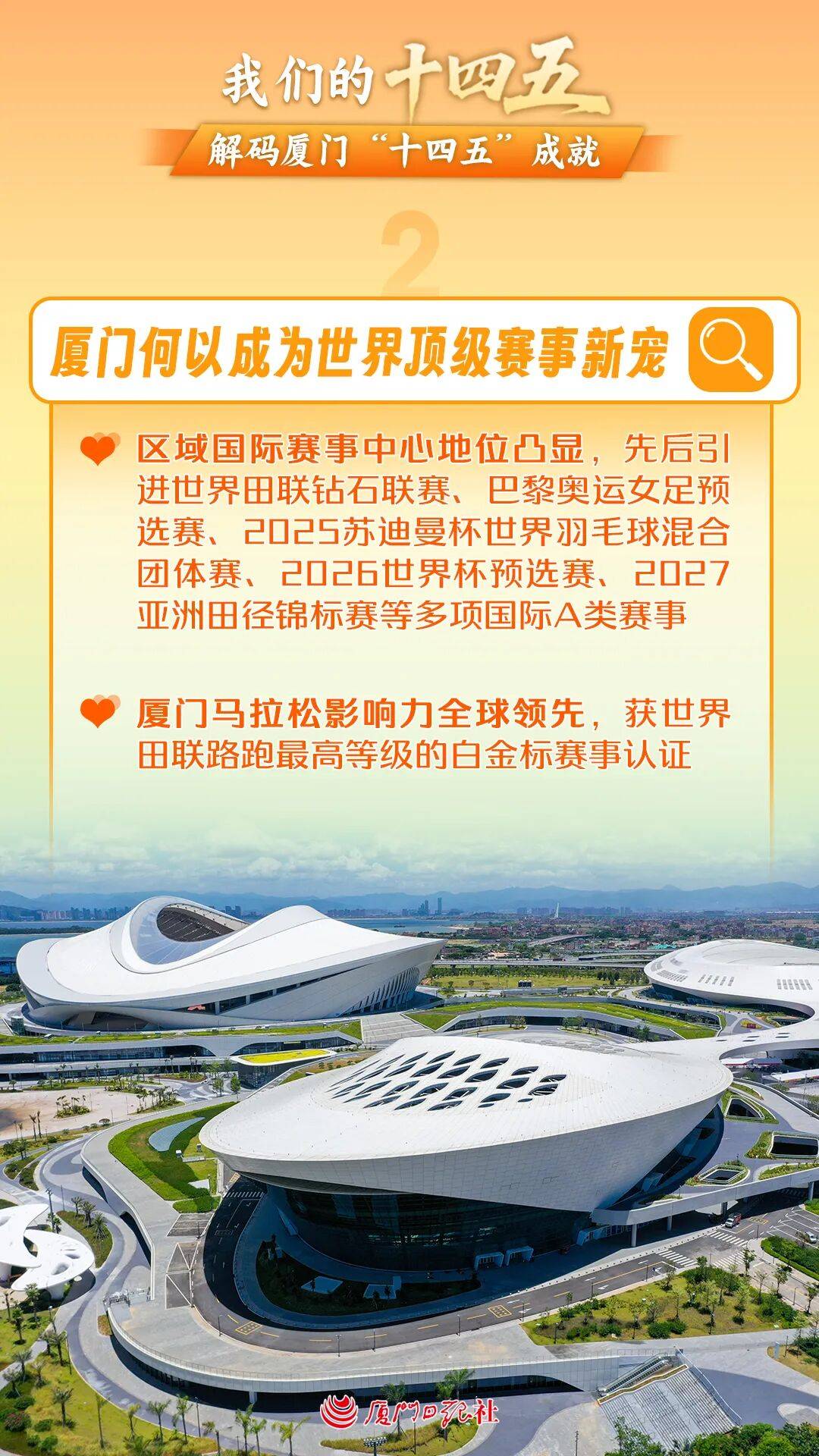 文体旅多元融合,释放城市魅力,五年来,厦门文旅“硬实力”持续提升,“跟着赛事去旅行”成了新时尚,“为一首歌奔赴一座城”成了新潮流。先后引进世界田联钻石联赛、巴黎奥运女足预选赛、苏迪曼杯世界羽毛球混合团体赛等多项国际A类赛事,厦门马拉松赛影响力持续扩大;全市新增体育场地面积756.8万平方米;鼓浪屿打造音乐圣地“365行动方案”,每日有音乐声、每周有音乐演、每月有音乐会、每季有音乐节……厦门全力做热“演艺+”“音乐+”“体育+”等新业态,将赛事展演活动的“流量”转化为城市“留量”,文体旅融合的叠加效应正在持续释放。