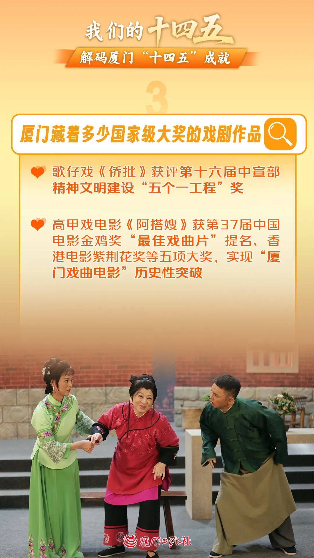 歌仔戏《侨批》获评第十六届中宣部精神文明建设“五个一工程”奖;高甲戏电影《阿搭嫂》获第37届中国电影金鸡奖“最佳戏曲片”提名、香港电影紫荆花奖等五项大奖,实现“厦门戏曲电影”发展领域历史性突破。
