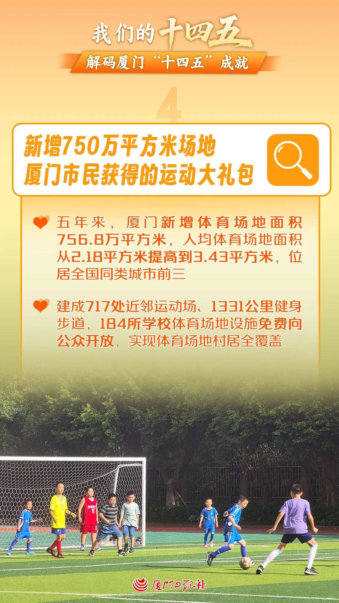五年来,厦门新增体育场地面积756.8万平方米,人均体育场地面积从2.18平方米提高到3.43平方米,增长超50%,位居全国同类城市前三。盘活街头巷尾边角地、公园绿地,建成717处近邻运动场、1331公里健身步道,184所学校体育场地设施免费向公众开放,实现体育场地村居全覆盖。搭建“厦门i健身”智慧服务平台,汇聚全市6250处体育场地设施,方便市民一键预约、就近运动,已注册用户超120万人,入场锻炼人次超1300万。