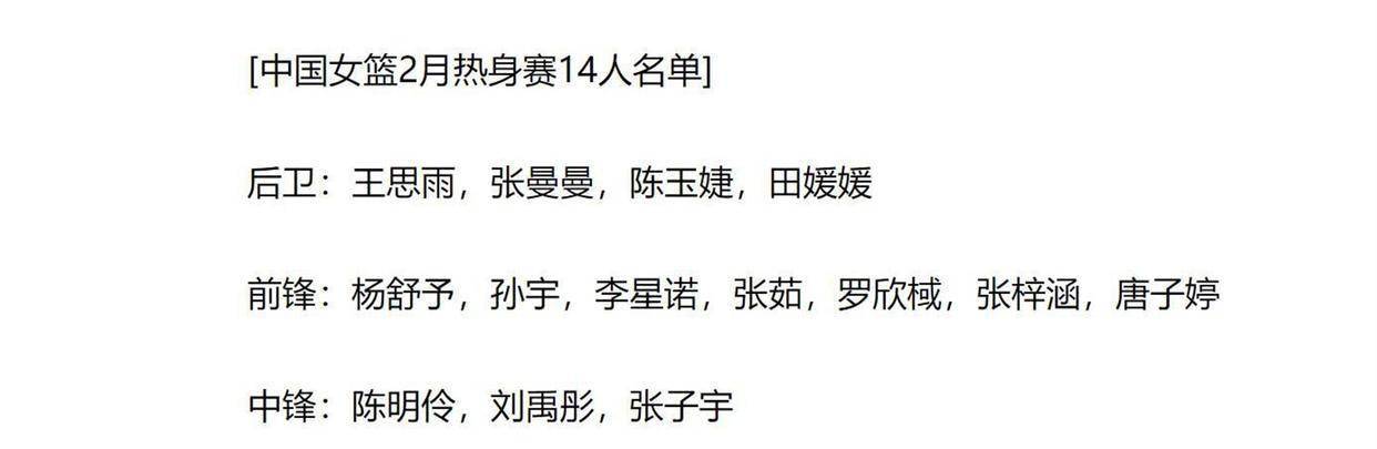 这份名单直接关联到2月7日在合肥与2月11日在银川的两场国际热身赛。 这也是WCBA联赛常规赛结束后,国家队进行的首次集结和实战检验。