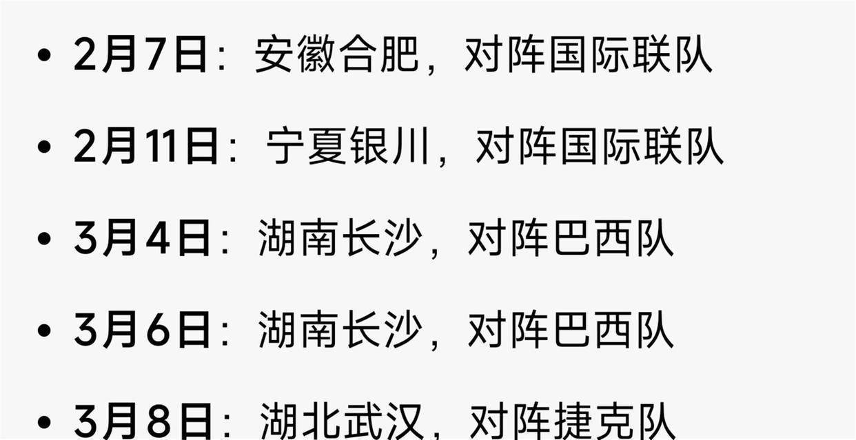 3月8日,中国队还将在武汉与捷克队进行一场友谊赛。 这些热身赛允许无限次换人,以便测试不同球员组合的实战效果。