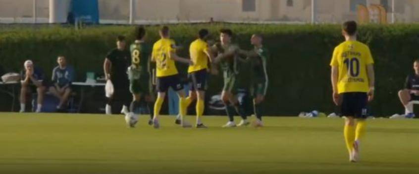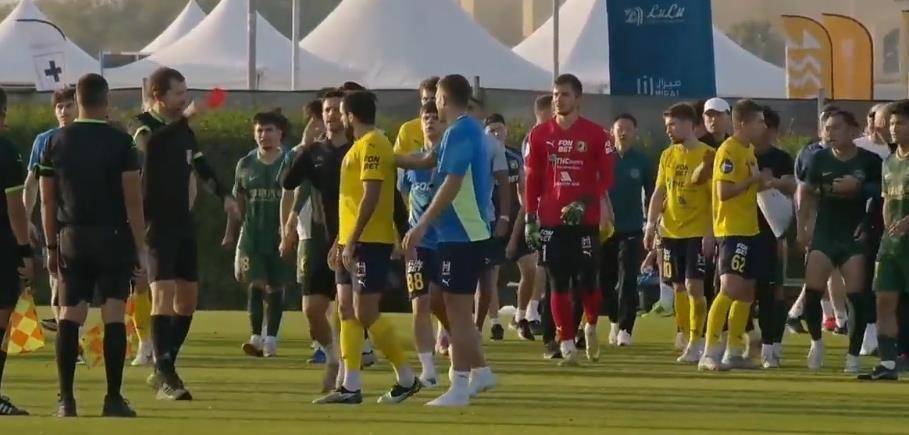 事情的具体经过是这样的。 比赛一开始,罗斯托夫的球员就频频上强度,动作很大,犯规一个接一个,场上的火药味很快就浓了起来。 毕竟浙江队的新赛季中超马上就要开打,谁也不想在热身赛里非战斗减员。 矛盾的彻底爆发点在第23分钟,罗斯托夫的99号球员苏莱马诺夫,在一次对抗中对浙江队的后卫刘浩帆做出了一个明显的报复性动作。 从流传出来的视频画面看,苏莱马诺夫多次试图掌掴刘浩帆,虽然刘浩帆也有回击,但相对克制,主要是阻止对方的袭击。 当值主裁判没有任何犹豫,直接出示红牌把苏莱马诺夫罚下了场。 可这张红牌并没有让事态平息,反而像点燃了炸药桶的引信,双方人员瞬间涌入场内,场面一片混乱,彻底失控。 为了保护球员的安全,浙江队最终做出了决定:离开球场,终止比赛。